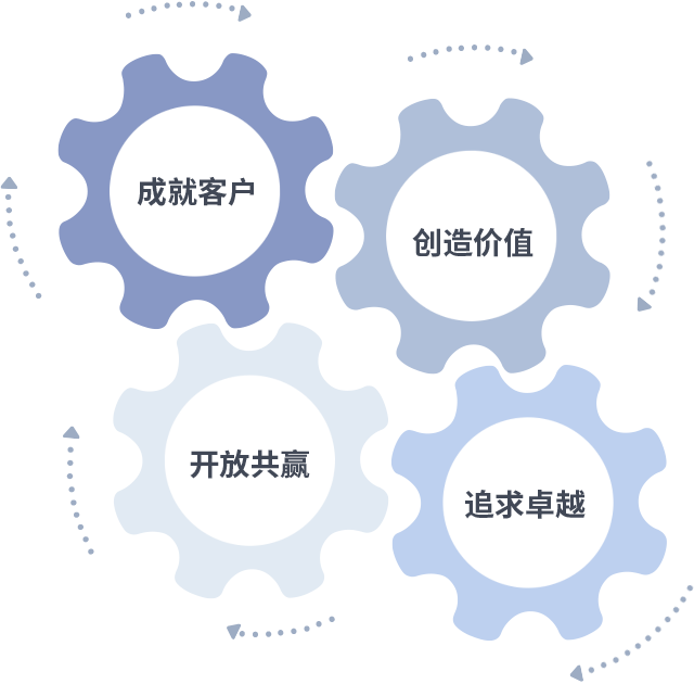 成就客户是一切决策的出发点,,,,创造价值是衡量所有工作的标准,,,追求卓越是ag博天堂做事做人的态度,,,,开放共赢是ag博天堂的格局也是最终的结果。。。。价值观的齿轮环环相扣,,推动着组织里的每个人不断向前。。